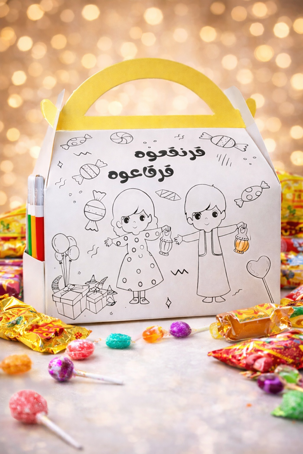 علبة تلوين مع أقلام ألوان، وبداخلها حلويات وشبس لقرقيعان أحلى 🍭
